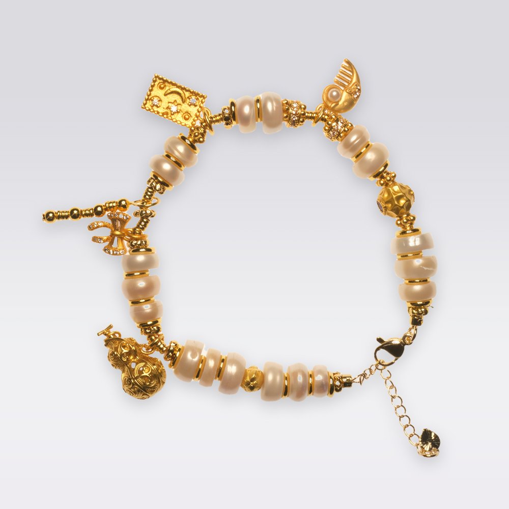 Crafted from natural rice pearls and accented with an elegant gold-plated gourd charm, this bracelet represents grace, protection, and prosperity — making it ideal for those who appreciate meaningful jewelry with cultural depth.