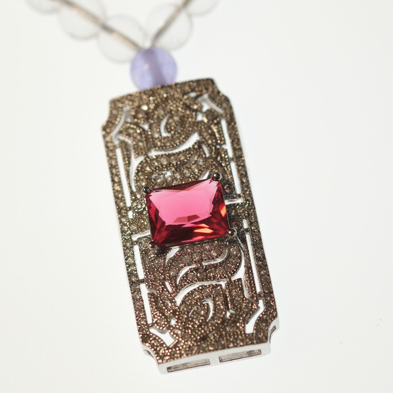 This necklace is a modern ode to cultural harmony. Its elongated rectangular pendant features an intricately engraved Chinese Feitian (Flying Apsara) motif – celestial dancers symbolizing spiritual ascension in ancient Buddhist art. At the heart of the design, a vibrant lab-created ruby pulses like a divine ember, framed by precision-cut moissanite borders that evoke contemporary architectural precision. The necklace body combines smooth white crystal beads accented with natural purple amethyst, weaving 5,000 years of Eastern philosophy with cutting-edge Western gem science.