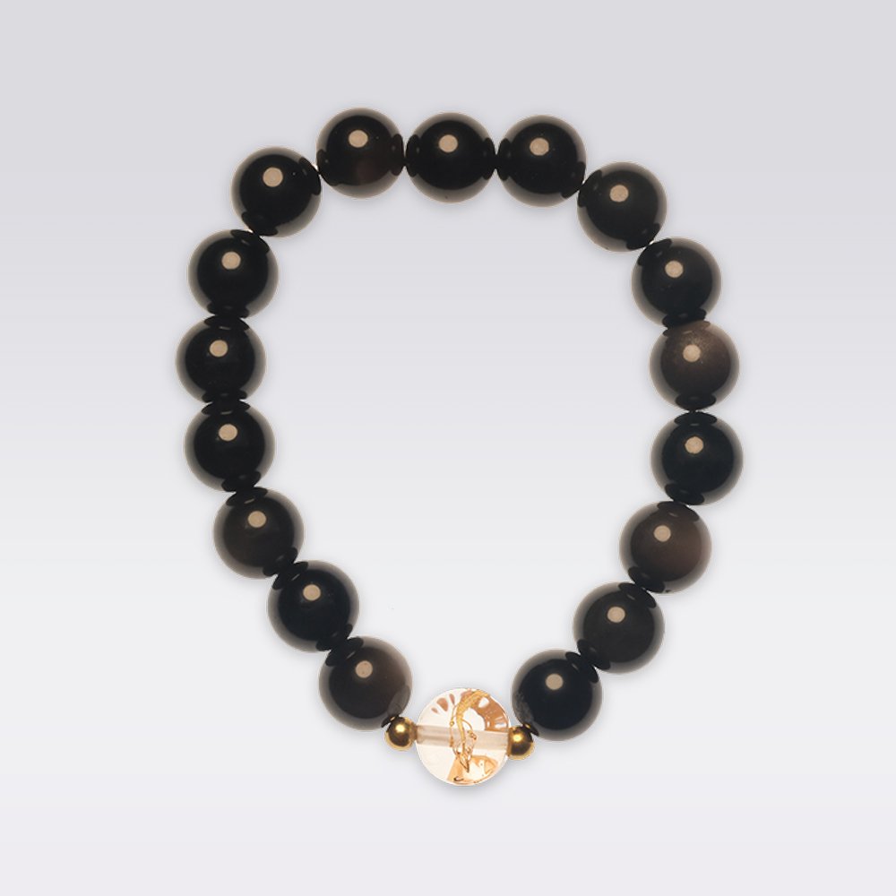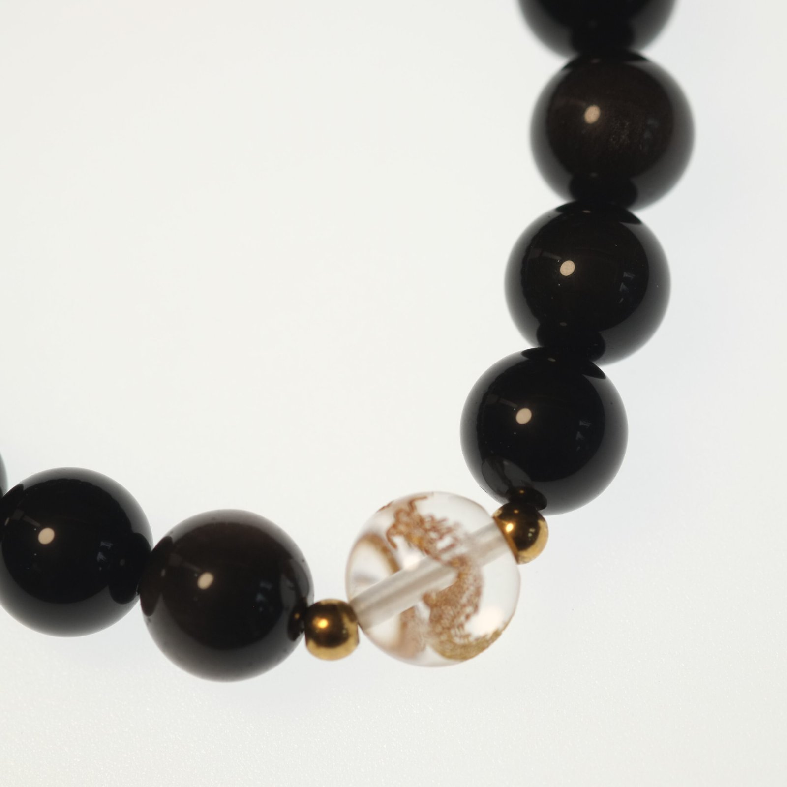 Protection-Buddhist Black Obsidian & Clear Quartz Gold-Dragon Bead Bracelet