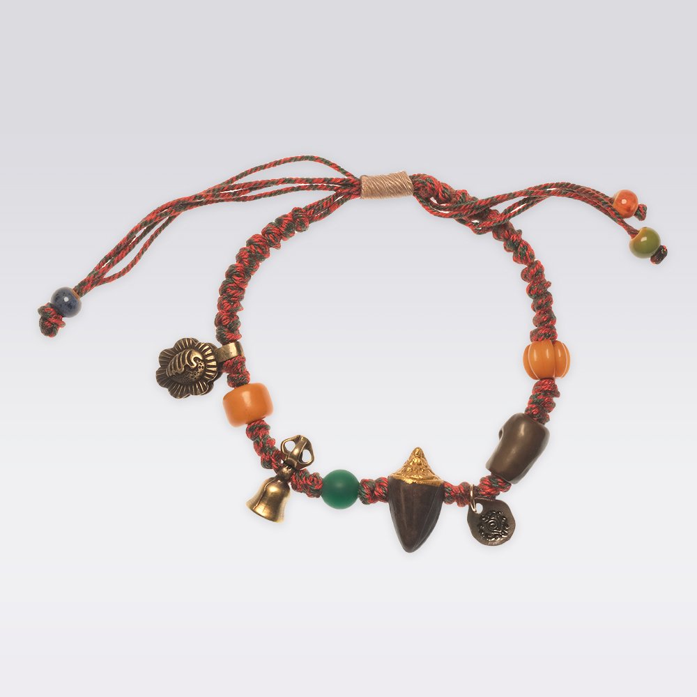 The Nangla Terma Stupa is revered by Tibetan communities as a sacred relic. Believed to summon the blessings of Bodhisattvas, Dharma Protectors, and enlightened beings, it acts as a “Diamond Armor” shielding wearers from negative energies, malevolent forces, and harmful spells. This bracelet combines the Nangla Terma Stupa with traditional Tibetan braided cords, aged bone beads, green agate cylinder beads, Dharma Bell (Jiangmo Ling), and protective charms (A Dai), creating a powerful spiritual ensemble.