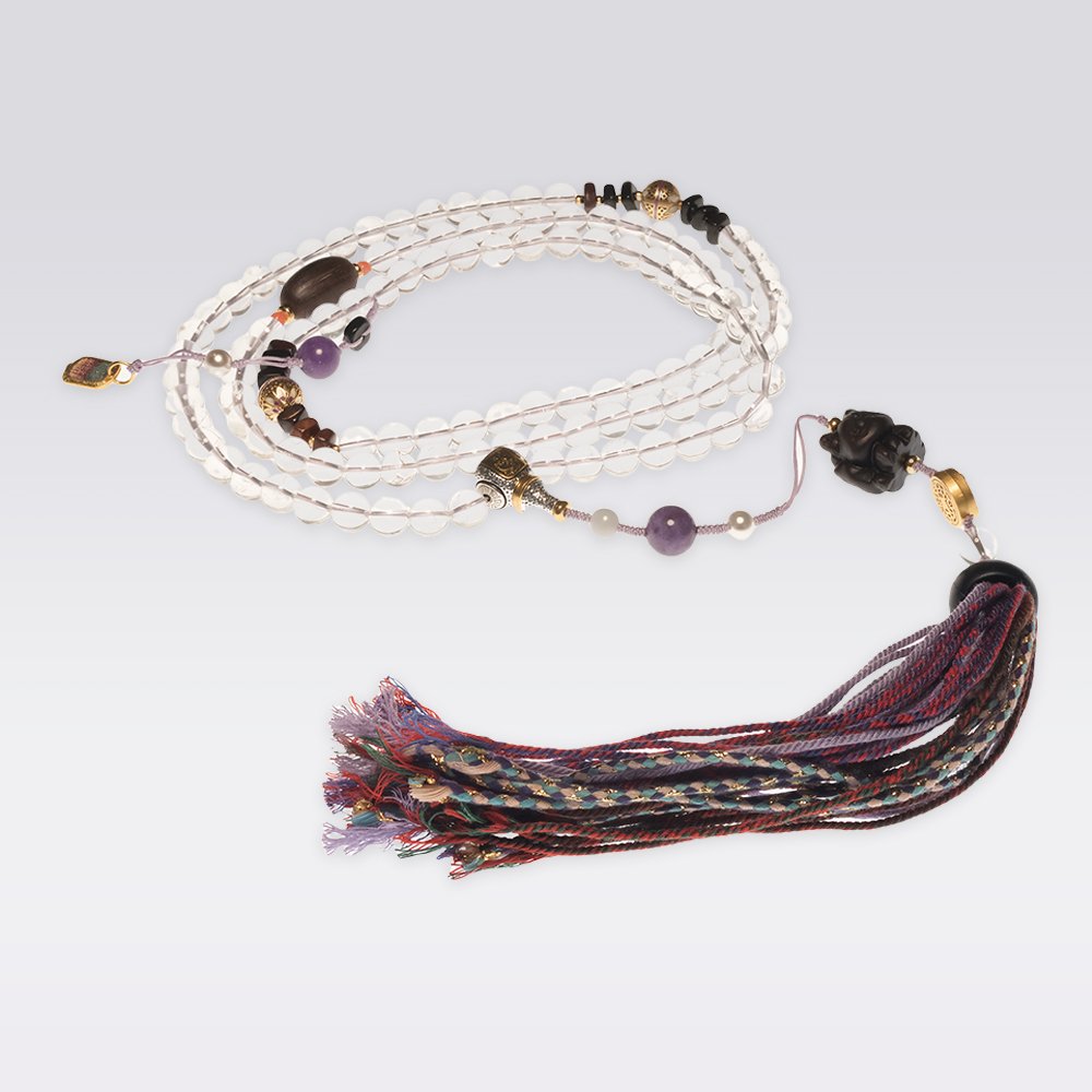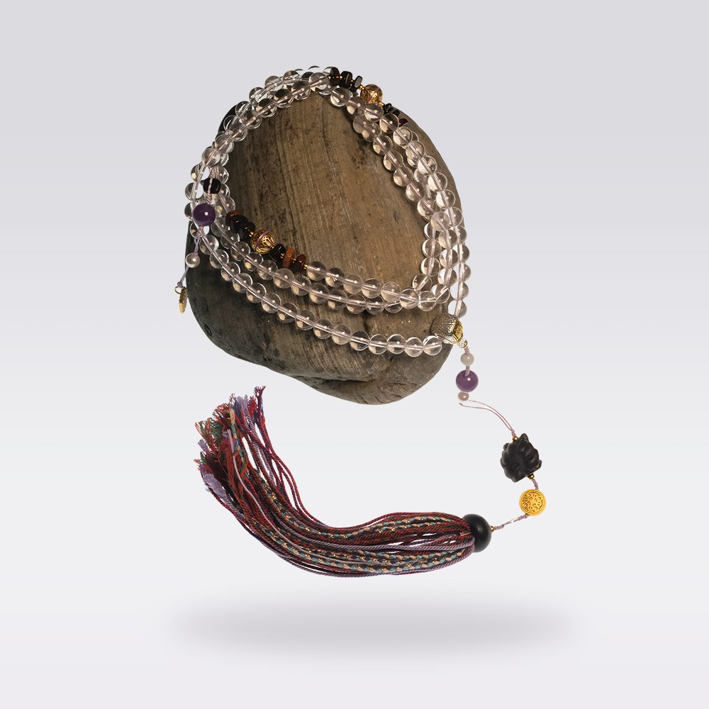 Crafted from natural clear quartz beads, aged sandalwood wood, and adorned with an elegant nine-tailed fox pendant, this bracelet combines spiritual energy with cultural symbolism. It represents clarity, protection, and charm — making it ideal for those who appreciate meaningful jewelry with spiritual depth.